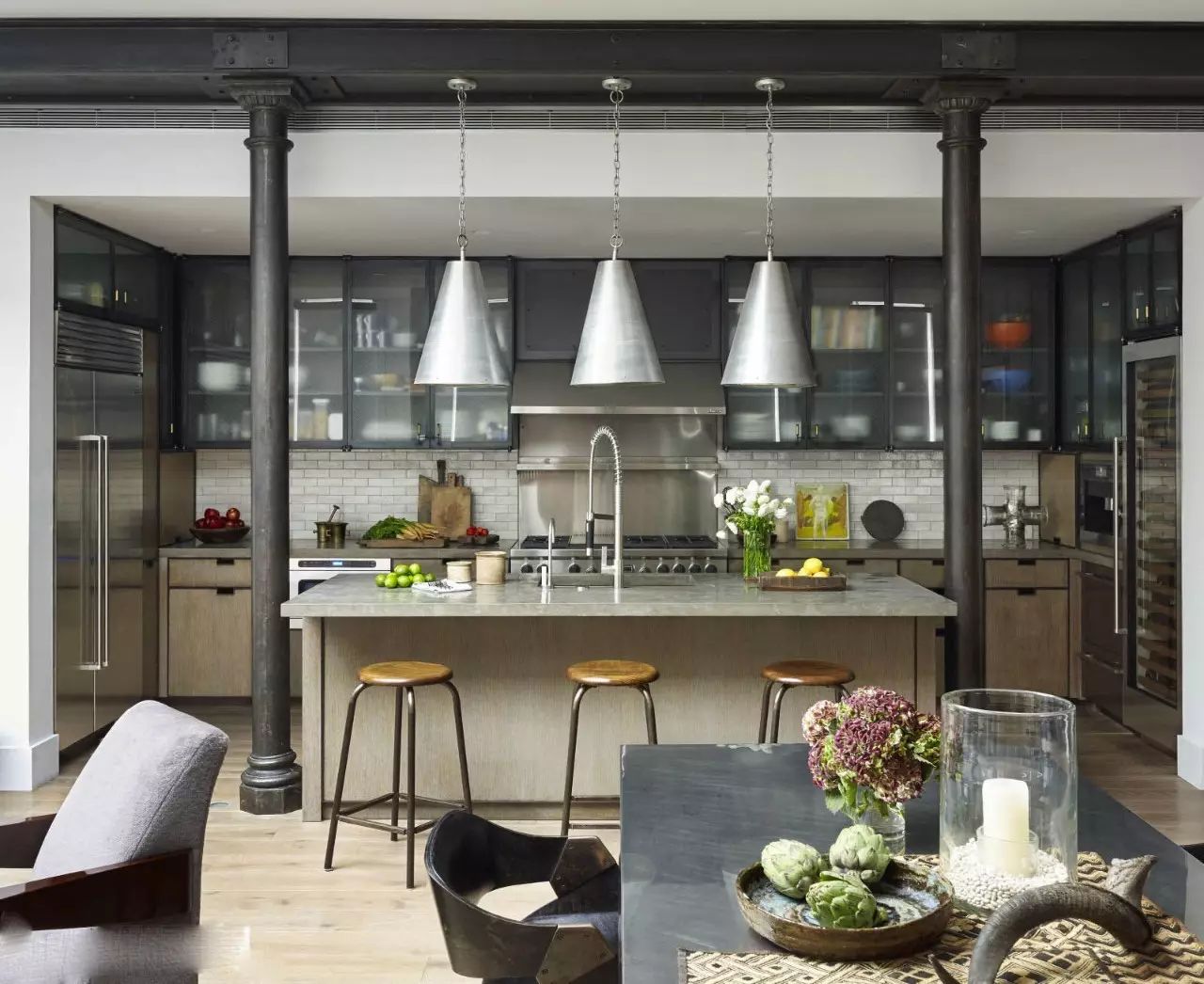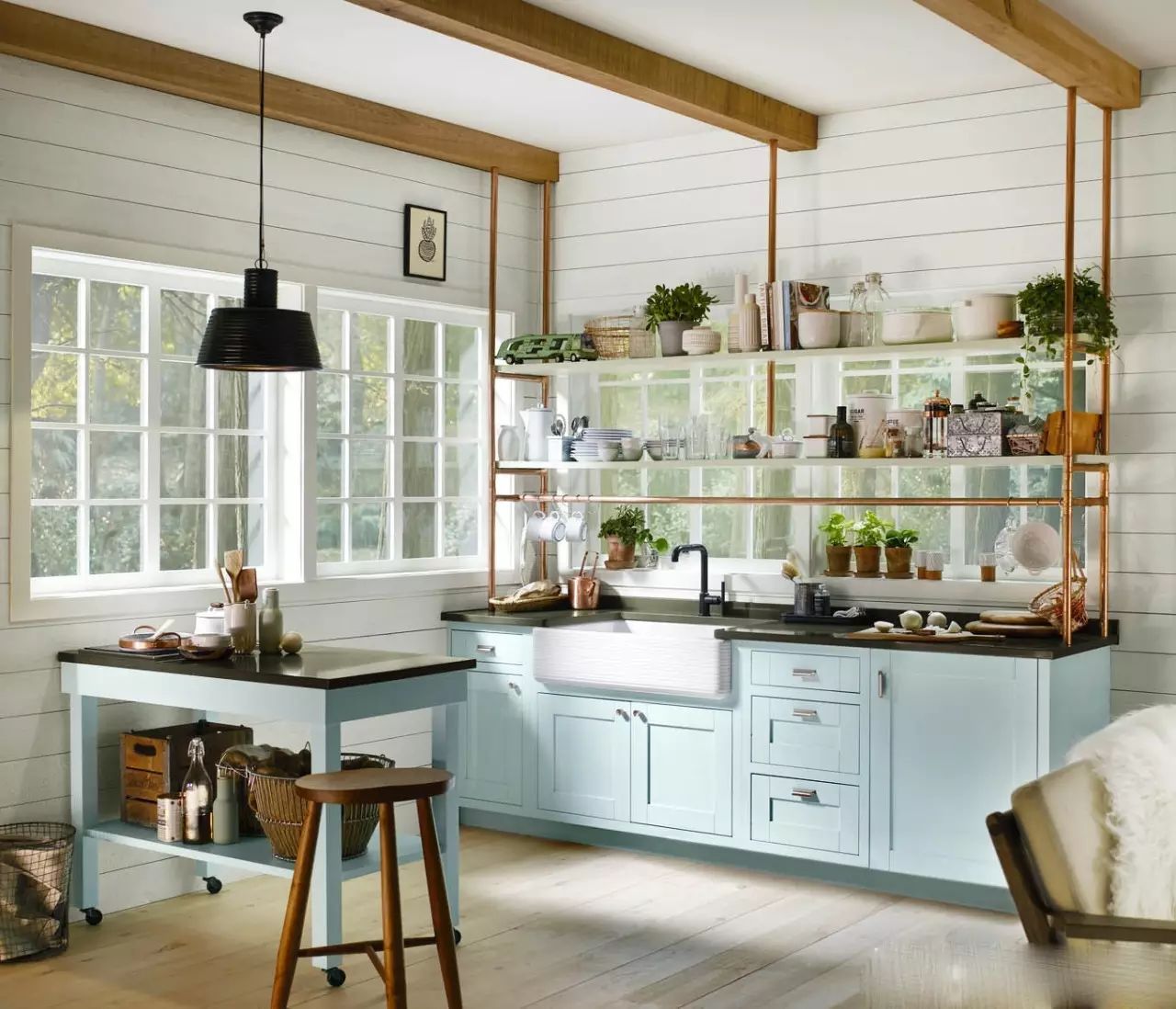 粉藍(lán)色的實(shí)木櫥柜搭配金屬工業(yè)管,這樣的搭配出奇的適合呢~