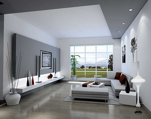 大面積白色烤漆背景墻面與灰橡木地面搭配,